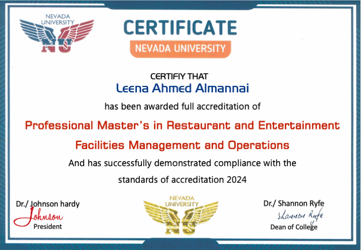 This certificate above verifies that Leena Ahmed Almannai successfully completed the course on from Nevada University. The certificate indicates the entire course was completed as validated by the student.