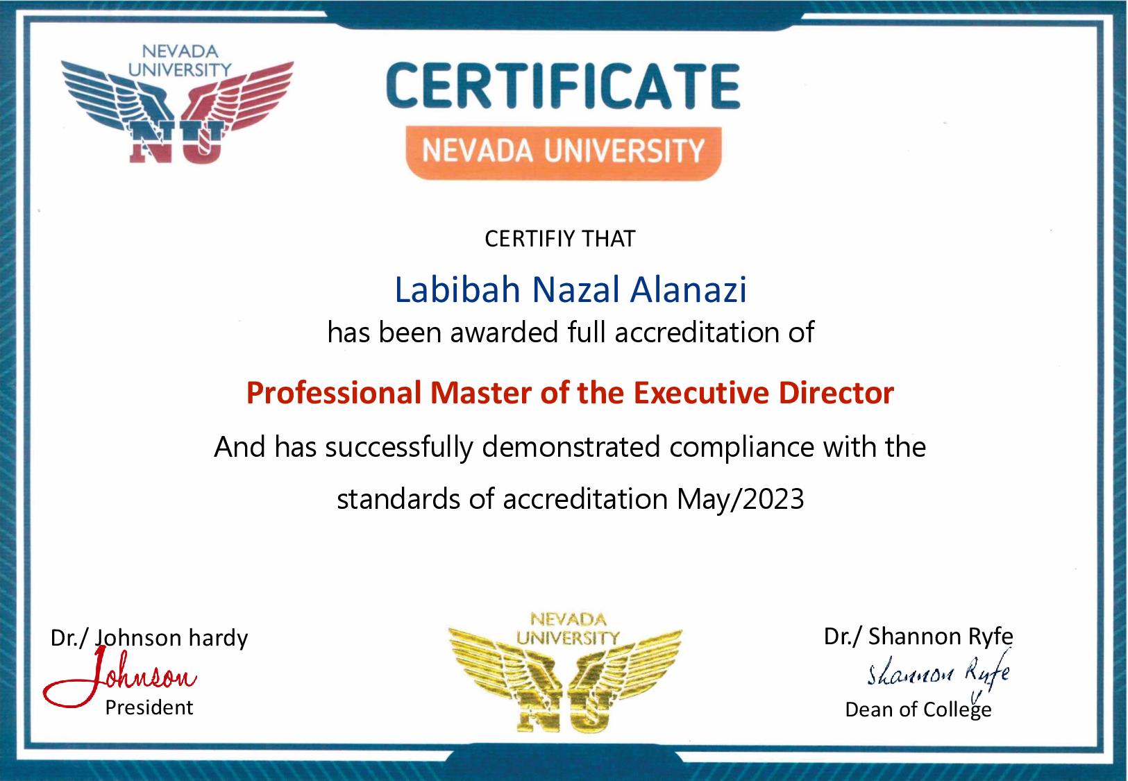✅ Certificate VerificationWe hereby confirm that this certificate is genuine and officially issued by Nevada University, upon successful completion of all professional requirements. It certifies that Dr. Luai Sadi Hussain Al Qadri has been awarded the degree of Professional Doctorate in Hospital Management, with all rights and privileges thereto appertaining.
